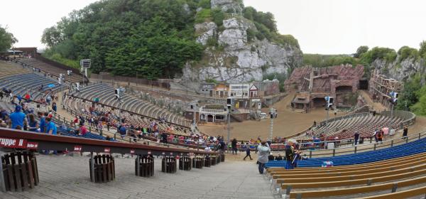 In Segeberg sind wir also nach einem Restaurantbesuch (und einem Wolkenbruch der uns kurzzeitig Kummer bereitete) voller Vorfreude in die Kalkbergarena zur Abendvorstellung (....und da kam die Sonne wieder zum Vorschein).