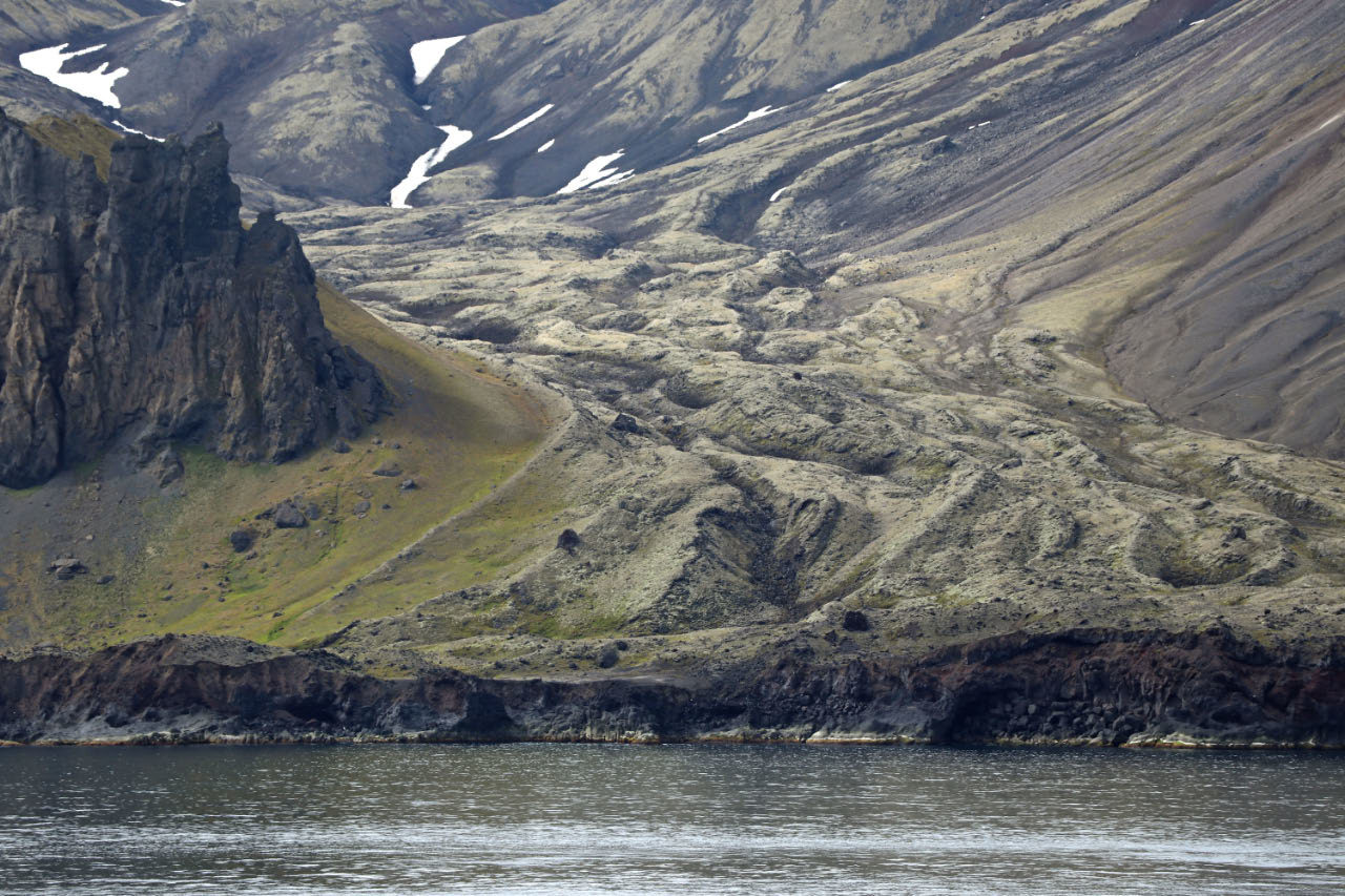Die Insel lag zwar noch im Morgengrauen vor uns, doch die See war einigermaßen friedlich und die Spitze des Beerenberg (Norwegen's einzigster Vulkan) zeigte sich noch in eine Wolke gehüllt. Aber wir haben uns sagen lassen, daß er dies gerne einen Großteil des Jahres tut und sein Haupt einfach nicht gerne der Öffentlichkeit präsentiert.