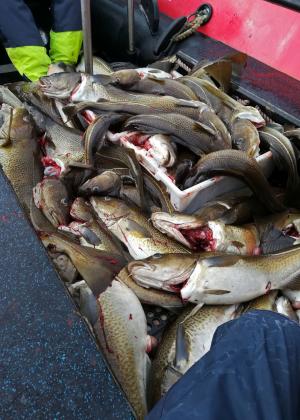 Zwischendurch hatten die Passagiere noch die Möglichkeit einen, in Einzelteile zerlegten Dorsch zu bewundern. Kristin, die Biologin des Teams, hatte einen unserer Fische mit an Deck genommen und ordentlich zerstückelt. Die Innereien waren zwar nicht gerade lecker anzusehen, aber doch interessant was man so im Mageninhalt vorfinden kann oder wie groß z.B. das Hirn eines Fisches ist........usw.