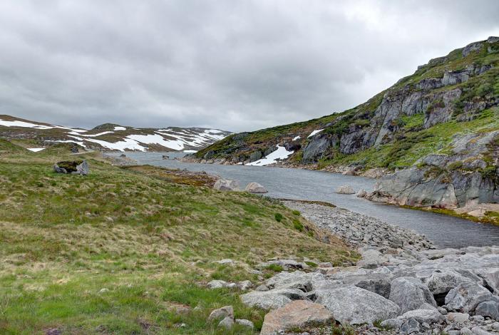 Daher packten wir das Nötigste ins Auto und brachen auf. Zuerst mal ins Landesinnere. Wir wollten nämlich den berühmten Skuleskarveien fahren, der von West nach Ost (oder umgekehrt) durch's Land führt und nur in den Sommermonaten geöffnet ist. Im Winter liegt da dermaßen viel Schnee rum, so daß die Schneeräumkavallerie mehrere Wochen braucht um diesen Weg überhaupt freizubekommen. Manchmal liegen da bis zu 10 Meter hohe Schneemassen.